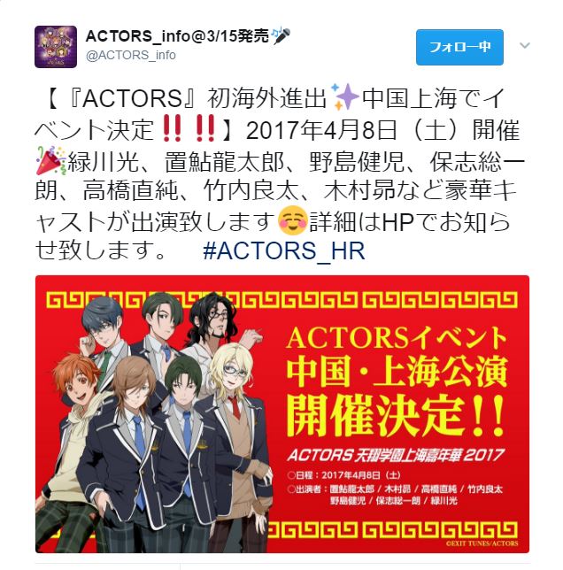 主はACTORSにハマって「約半年」の颯馬くん本命の歌唱部クラスタです。